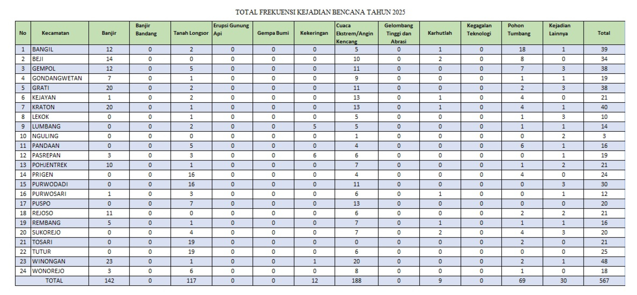 Pasuruan - Data kejadian bencana di Kabupaten Pasuruan menunjukkan bahwa bencana hidrometeorologi masih mendominasi sepanjang periode pencatatan. Dari total 567 kejadian bencana yang tercatat di 24 kecamatan, cuaca ekstrem atau angin kencang menjadi kejadian paling banyak dengan 188 peristiwa.